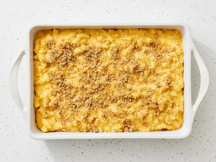 6. Add cheese sauce to pasta and stir to combine; transfer mixture into a 9x13-inch baking dish. Top with seasoned bread crumbs.